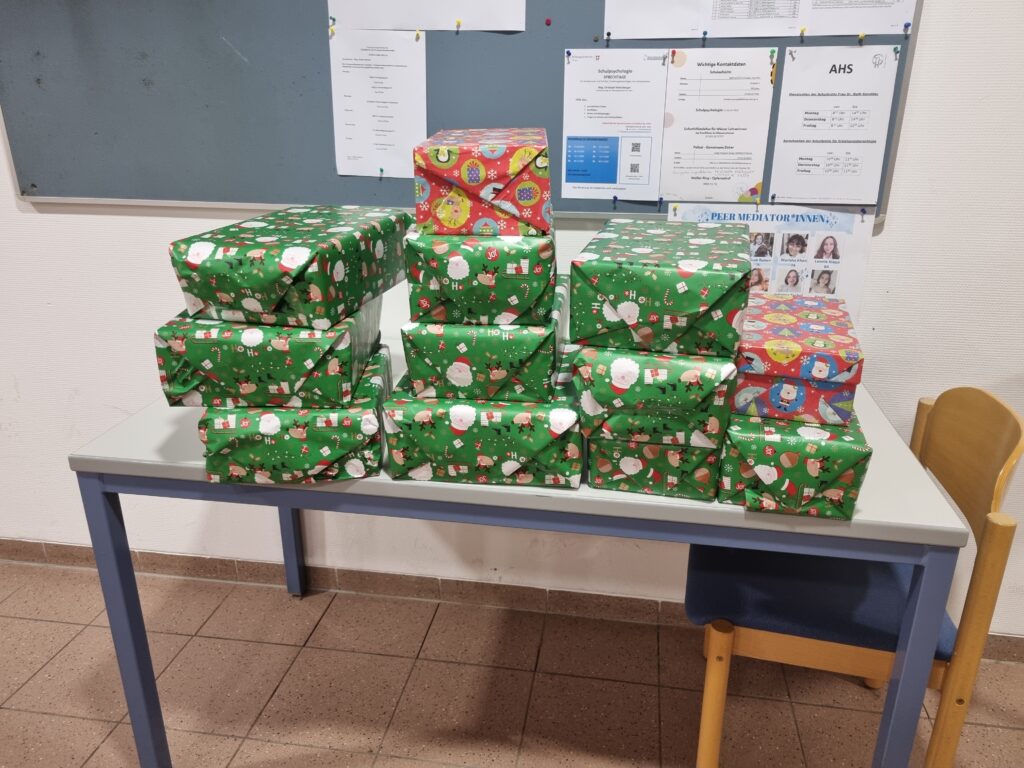 Deshalb nahm unsere Klasse heuer an der „Christkind – Aktion“ des Wiener Jugendrotkreuzes teil. Alle von uns organisierten wunderbare Kleinigkeiten, passend für Kinder im Alter zwischen 7 und 10 Jahren. Eifrig befüllten wir damit leere Schuhkartons und verwandelten diese zu richtig tollen Weihnachtsgeschenken. Schon beim Einpacken war zu erkennen, wie viele Gedanken sich jeder Einzelne von uns beim Einkauf gemacht hatte. Die Vielzahl an liebevollen Ideen war wunderbar.