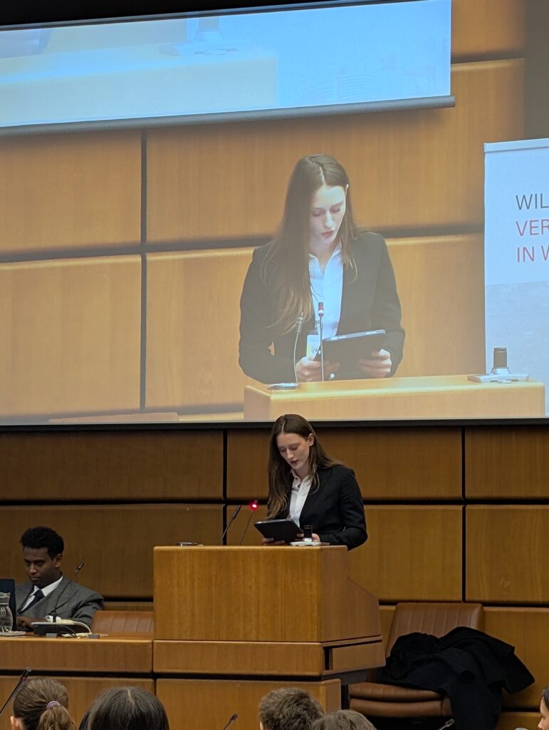 Am 11.02.2026 begann das Programm mit mehreren sehr informativen Vorträgen an der Uni Wien. Danach hielt die Gruppe in den einzelnen Komitees Reden und brachte somit die Diskussionen zum Laufen. Die Wahlpflichtfach-Schüler*innen diskutierten wie tatsächliche Mitglieder der UN, zum Beispiel über Themen wie die Genomeditierung in der Landwirtschaft, Biowaffen und Sicherung der Lieferketten. Nach den aufschlussreichen Diskussionen wurde in den jeweiligen Komitees eine Resolution verfasst und begutachtet. Damit waren die ersten beide Tage des sehr inspirierenden Projekts vorüber.